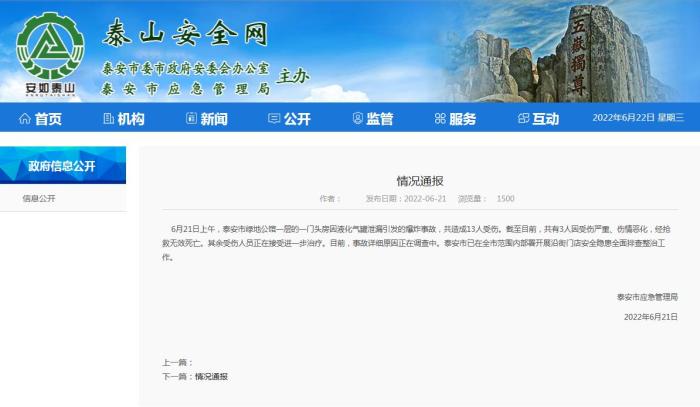 中新網6月22日電 據(jù)山東省泰安市應急管理局網站消息,山東泰安市應急管理局21日發(fā)布通報,6月21日上午,泰安市綠地公館一層的一門頭房因液化氣罐泄漏引發(fā)的爆炸事故,共造成13人受傷。截至目前,共有3人因受傷嚴重、傷情惡化,經搶救無效死亡。其余受傷人員正在接受進一步治療。