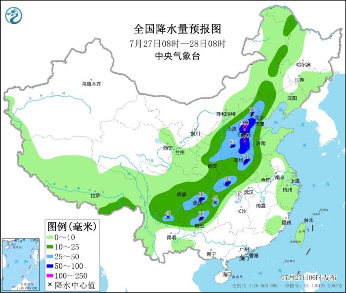 圖2 全國降水量預報圖(7月27日08時-28日08時)