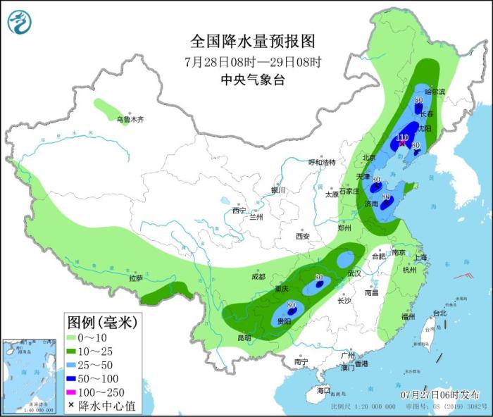 7月28日08時至29日08時,內蒙古東南部、東北地區(qū)西部和南部、華北東部、黃淮東部、江漢大部、湖南北部和西部、西南地區(qū)東南部等地部分地區(qū)有中到大雨,其中,遼寧中西部、山東中部、湖南北部、貴州中部等地部分地區(qū)有暴雨,局地大暴雨(100~110毫米)(見圖3)。