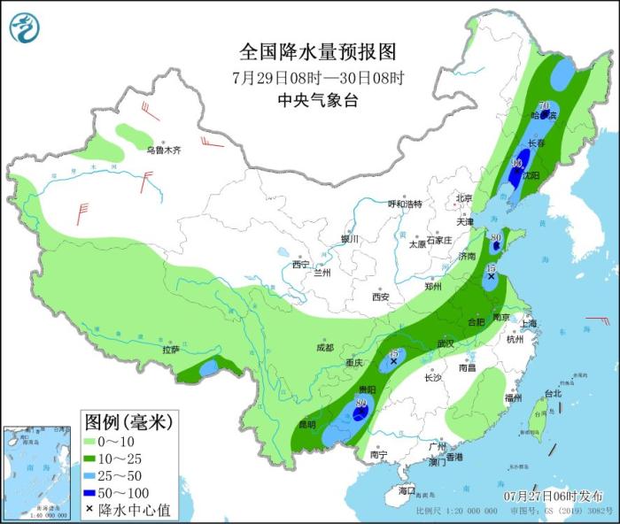 圖4 全國降水量預報圖(7月29日08時-30日08時)