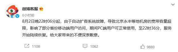 微博:2日晚自動擴(kuò)容系統(tǒng)故障 致北京永豐等地機(jī)房寬帶容量超限