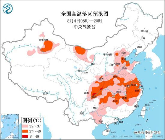 預(yù)計(jì)今天白天,陜西南部、河北大部、北京、天津、山東、河南、安徽、江蘇、上海、湖北、湖南大部、江西中北部、浙江、福建西北部、四川東部、重慶、貴州東部和南部、廣西西部等地有35℃以上的高溫天氣,其中,陜西南部、河北東部和南部、天津南部、山東北部、河南中南部、安徽西部和南部、江蘇中南部、上海大部、湖北西部、湖南北部、江西北部、浙江、四川東部、重慶、貴州東北部等地部分地區(qū)最高氣溫37~39℃,重慶局地可達(dá)40℃以上。