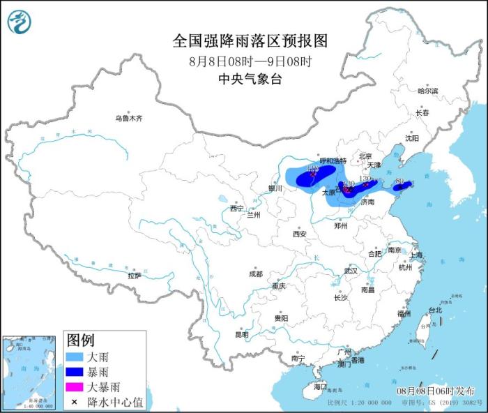 預(yù)計(jì),8月8日08時(shí)至9日08時(shí),內(nèi)蒙古河套地區(qū)、陜西北部、山西北部和東部、河北中南部、山東北部等地的部分地區(qū)有大到暴雨,其中,陜西北部、河北南部、山東西北部等地局地有大暴雨(100~130毫米)。上述部分地區(qū)伴有短時(shí)強(qiáng)降水(最大小時(shí)降雨量20~50毫米,局地可超過(guò)60毫米),局地有雷暴大風(fēng)等強(qiáng)對(duì)流天氣。中央氣象臺(tái)8月8日06時(shí)繼續(xù)發(fā)布暴雨藍(lán)色預(yù)警。