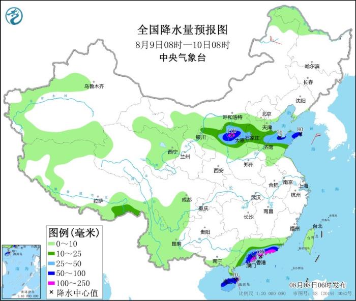 8月9日08時(shí)至10日08時(shí),內(nèi)蒙古河套地區(qū)、西藏東南部、寧夏北部、陜西北部、山西中北部、河北中南部、山東北部、廣東南部沿海、海南島等地部分地區(qū)有中到大雨,其中,陜西北部、山西中部、山東中東部、廣東南部沿海、海南島北部等地部分地區(qū)有暴雨或大暴雨(100~150毫米)。內(nèi)蒙古東北部部分地區(qū)有4~5級(jí)風(fēng)。南海東北部海域?qū)⒂?~7級(jí)、陣風(fēng)8級(jí)增大到7~8級(jí)、陣風(fēng)9級(jí)的東南風(fēng)。