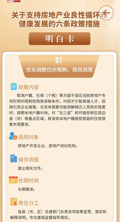 根據(jù)政策明白卡,廊坊優(yōu)化調(diào)整住房限購、限售政策。取消戶籍、社保(個稅)等方面不適應(yīng)當(dāng)前房地產(chǎn)市場形勢的限制性購房資格條件。對招才引智高端人才、招商引資企業(yè)高管、北京非首都功能疏解隨遷人員購買首套時,按照本地戶籍對待。對“北三縣”和環(huán)雄安新區(qū)周邊縣(市)等重點區(qū)域,取消非本地戶籍居民家庭的住房限售年限要求。
