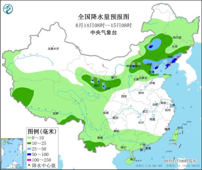 8月14日08時至15日08時,內(nèi)蒙古東部、青海東北部、甘肅南部、寧夏南部、華北中北部、山東北部、遼寧大部、吉林東南部、云南南部等地部分地區(qū)有中到大雨,其中,遼寧東部和南部、河北東北部等地部分地區(qū)有暴雨,局地大暴雨(100~120毫米)。內(nèi)蒙古中西部、新疆東部等地部分地區(qū)有4~6級風(fēng)。