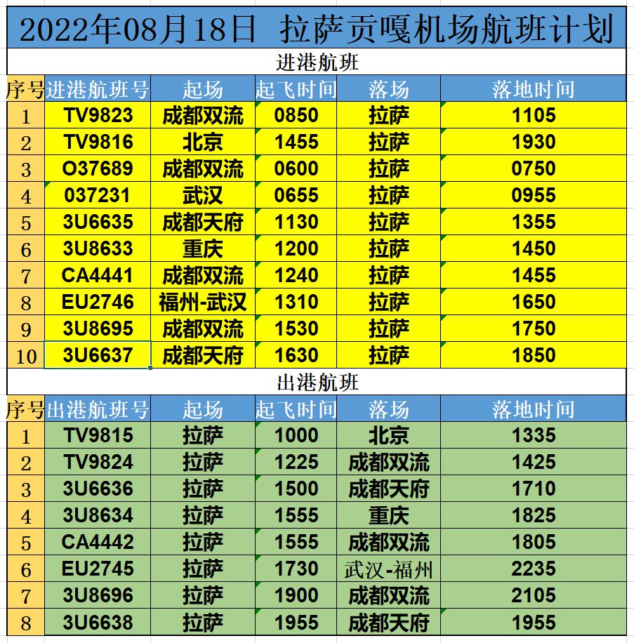 因公共安全原因,8月18日,拉薩貢嘎機(jī)場部分航班取消,計劃執(zhí)行進(jìn)出港航班18架次,分別為: