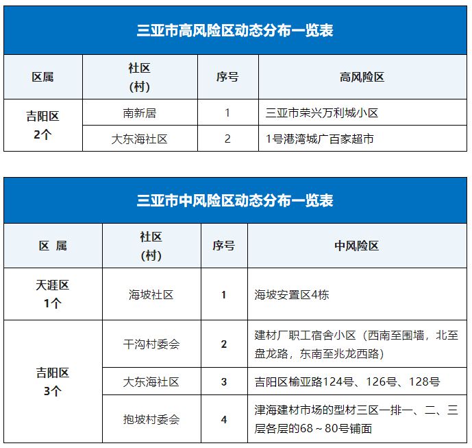9月19日,記者從海南省三亞市新型冠狀病毒肺炎疫情防控工作指揮部獲悉,根據(jù)當前三亞市疫情防控工作需要,按照國務院應對新型冠狀病毒肺炎疫情聯(lián)防聯(lián)控機制綜合組《新型冠狀病毒肺炎防控方案(第九版)》相關規(guī)定,經(jīng)專家組研判,三亞市疫情防控指揮部決定,將紅旗街社區(qū)椰風巷79、81、83號樓等區(qū)域調(diào)整為低風險區(qū),自通告發(fā)布起,高風險區(qū)調(diào)整為2個、中風險區(qū)調(diào)整為4個(見附表)。除高、中風險區(qū)外的區(qū)域為低風險區(qū)。
