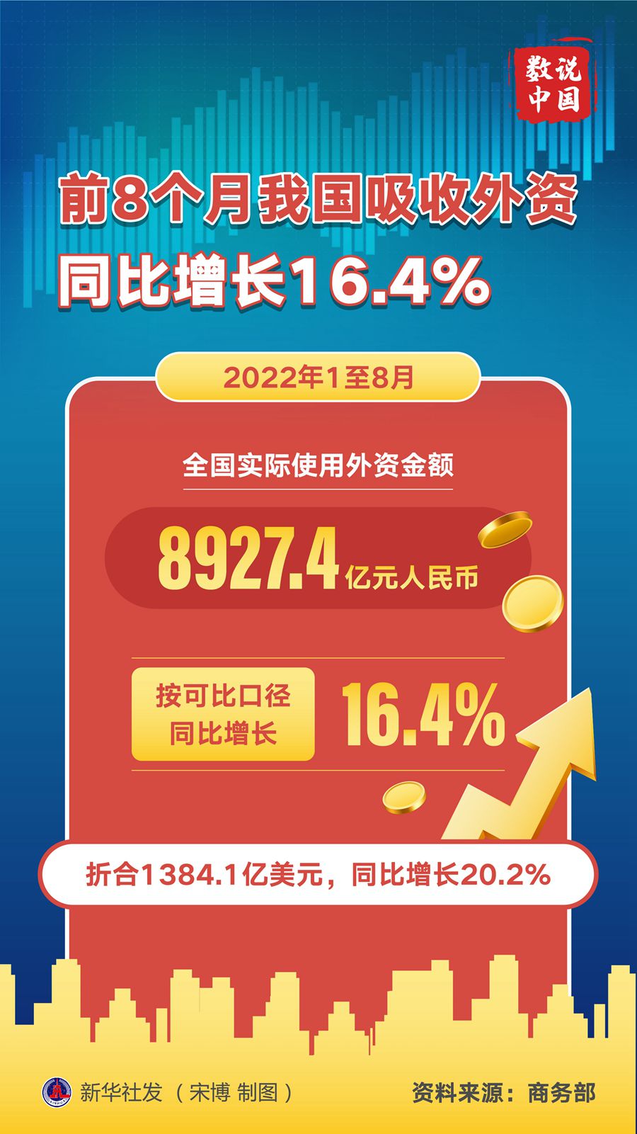 新華社北京9月19日電 (記者 謝希瑤)記者19日從商務(wù)部獲悉,2022年1至8月,全國實際使用外資金額8927.4億元人民幣,按可比口徑同比增長16.4%(下同),折合1384.1億美元,同比增長20.2%。