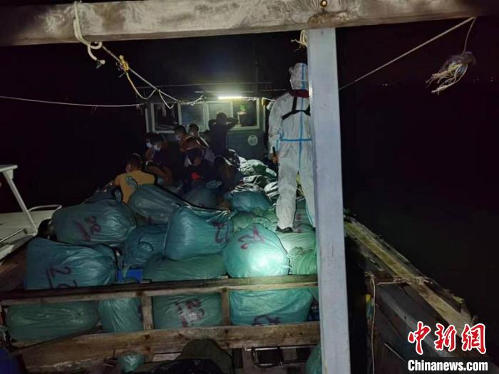 案發(fā)當(dāng)晚22時(shí)許,防城港海警局東興第一工作站執(zhí)法員在海域巡邏時(shí),發(fā)現(xiàn)一艘裝有大量袋裝貨物的漁船,形跡可疑。執(zhí)法員隨即向可疑船鳴笛、喊話亮明身份,要求其立即停船接受檢查,執(zhí)法員穿戴好防護(hù)裝具后,登臨對(duì)船上人員進(jìn)行控制。