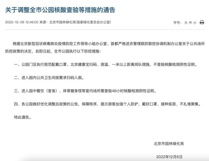 關(guān)于調(diào)整全市公園核酸查驗(yàn)等措施的通告。 北京市園林綠化局官網(wǎng) 攝