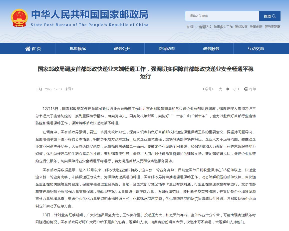 國家郵政局?jǐn)?shù)據(jù)顯示,進(jìn)入12月以來,郵政快遞業(yè)加快復(fù)蘇,迎來新一輪業(yè)務(wù)高峰,目前全國單日攬收量保持在3.6億件以上。快遞業(yè)迎來新一輪業(yè)務(wù)高峰,末端投遞壓力較大。為保障寄遞渠道的暢通,國家郵政局持續(xù)推進(jìn)保通保暢工作,動態(tài)疏解積壓的郵件快件。各快遞企業(yè)正在加快統(tǒng)籌全網(wǎng)資源,保障平穩(wěn)渡過業(yè)務(wù)高峰。目前,全國大部分地區(qū)堵點(diǎn)卡點(diǎn)已有效疏通,行業(yè)正在快速恢復(fù)有序運(yùn)行。北京市郵政管理局積極協(xié)調(diào)加強(qiáng)力量支撐保障,確?,F(xiàn)有6萬余名快遞小哥在崗力量,協(xié)調(diào)調(diào)派藥品、接種新型疫苗等措施,并督促各企業(yè)加緊調(diào)派京外力量馳援北京,要求企業(yè)優(yōu)化力量組織和末端投遞方式,化解現(xiàn)存積壓問題,優(yōu)先保障藥品和防疫物資等快件投遞。各郵政快遞企業(yè)均制定并啟動了應(yīng)急方案。