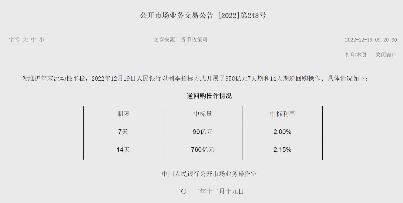 中新網(wǎng)12月19日電 據(jù)央行官網(wǎng)19日消息,為維護年末流動性平穩(wěn),2022年12月19日人民銀行以利率招標方式開展了850億元7天期和14天期逆回購操作。(中新財經(jīng))