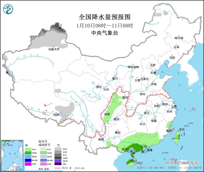 1月9日08時(shí)至10日08時(shí),新疆北部和西部山區(qū)、西藏西部等地部分地區(qū)有小到中雪,其中,新疆北疆北部、西藏西部局地有大到暴雪(10~18毫米)。江南中南部、華南大部、臺(tái)灣島等地部分地區(qū)有小到中雨,其中,廣東東北部和西南部沿海、海南島北部等地局地有大雨(25~45毫米)。西藏中西部等地部分地區(qū)有5~7級(jí)風(fēng)(見(jiàn)圖1)。