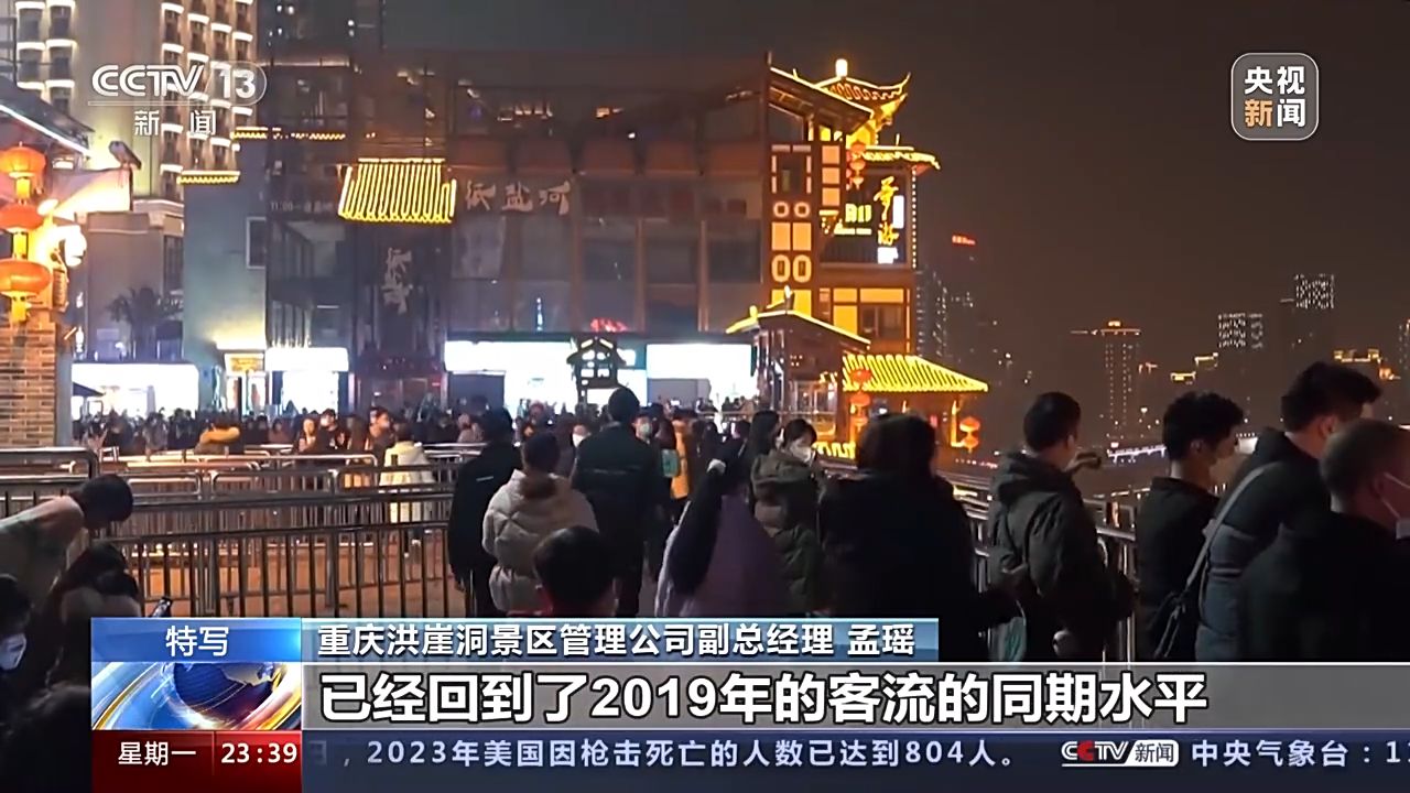 重慶洪崖洞景區(qū)管理公司副總經理 孟瑤:本來按照我們的預估,可能會在今年的二到三月份,游客量會有一個明顯的回升。元旦的第一天和第二天,我們的客流分別已經達到了6.4萬和6.2萬,已經回到了2019年的客流的同期水平,甚至已經超過了17%。