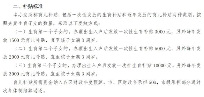 辦法擬規(guī)定,按照夫妻生育子女的數(shù)量,發(fā)放育兒補(bǔ)貼。其中,生育第一個子女的,辦理出生入戶后發(fā)放一次性生育補(bǔ)貼3000元,另外每年發(fā)放1500元育兒補(bǔ)貼,直至該子女滿3周歲;生育第二個子女的,辦理出生入戶后發(fā)放一次性生育補(bǔ)貼5000元,另外每年發(fā)放2000元育兒補(bǔ)貼,直至該子女滿3周歲;生育第三個子女的,辦理出生入戶后發(fā)放一次性生育補(bǔ)貼10000元,另外每年發(fā)放3000元育兒補(bǔ)貼,直至該子女滿3周歲。育兒補(bǔ)貼所需資金納入各區(qū)財(cái)政年度預(yù)算,市、區(qū)財(cái)政各承擔(dān)50%,市級承擔(dān)部分通過次年體制結(jié)算返還。(中新財(cái)經(jīng))