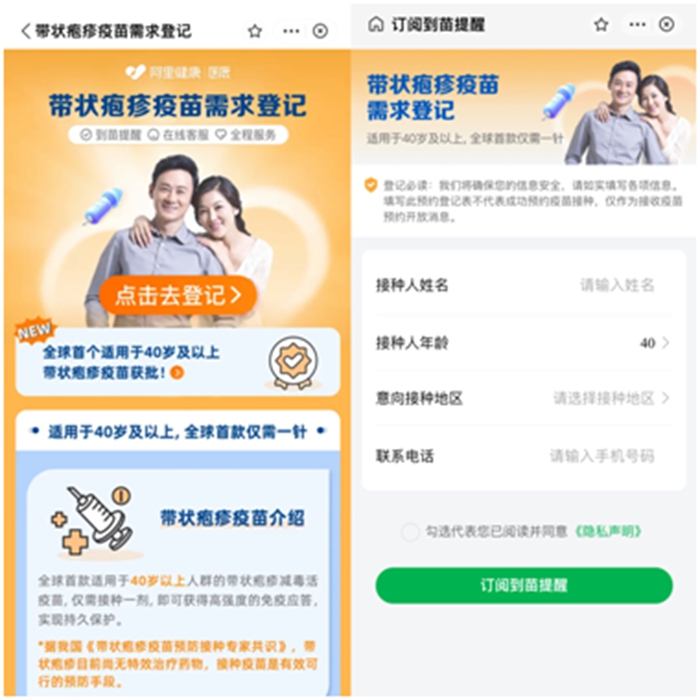 2日,阿里健康上線國產(chǎn)帶狀皰疹疫苗接種需求登記服務(wù),年齡40歲及以上、有接種需求的用戶可以在線填寫信息,訂閱到苗提醒。