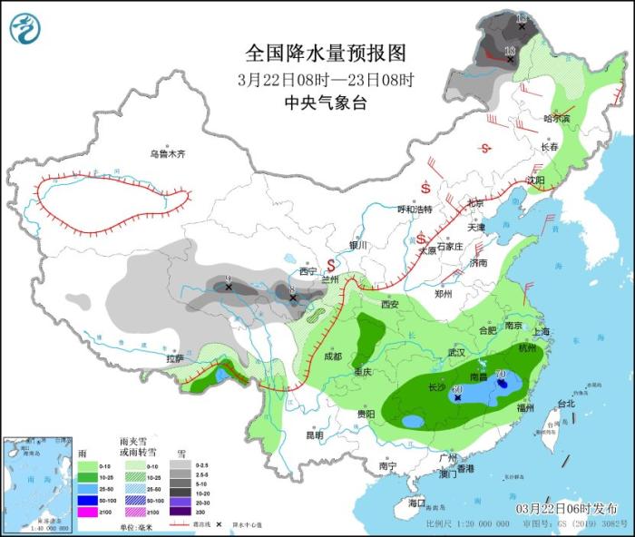 全國降水量預(yù)報圖(3月22日08時-23日08時)