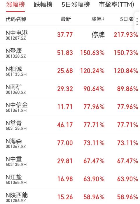 截至發(fā)稿時,N中電港停牌,N登康漲幅150.63%,N柏誠漲幅120.24%、N南礦漲幅90.64%,N中信金、N常青、N海森、N中重、N江鹽、N陜西能保持強勢上漲。