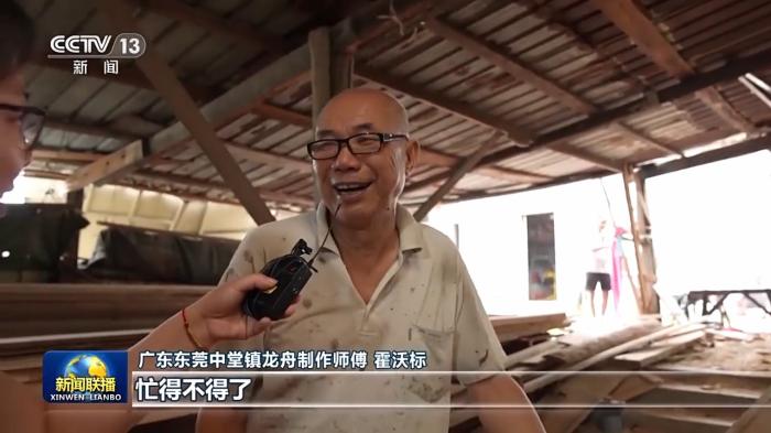 廣東東莞中堂鎮(zhèn)龍舟制作師傅霍沃標(biāo):忙得不得了,真的忙得不得了。今年龍舟(賽)特別特別多。我訂單都不敢接了。
