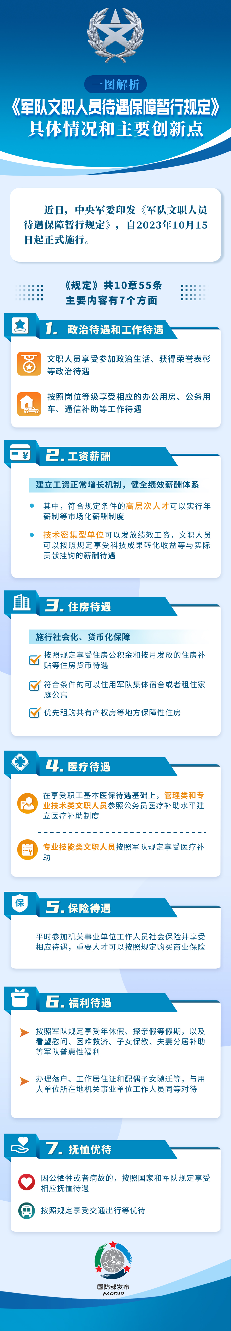 吳謙表示,近日,中央軍委印發(fā)《軍隊文職人員待遇保障暫行規(guī)定》,自2023年10月15日起正式施行。《規(guī)定》的出臺,將進(jìn)一步提高軍隊文職人員待遇保障,對于延攬社會優(yōu)秀人才獻(xiàn)身強(qiáng)軍事業(yè)、激發(fā)文職人員活力動力、促進(jìn)文職人員隊伍高質(zhì)量發(fā)展,將發(fā)揮重要作用。