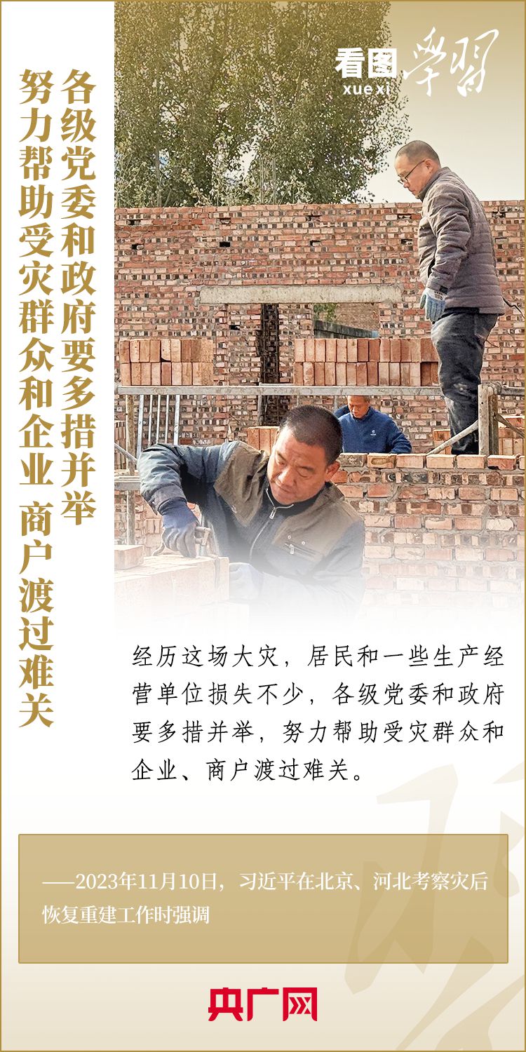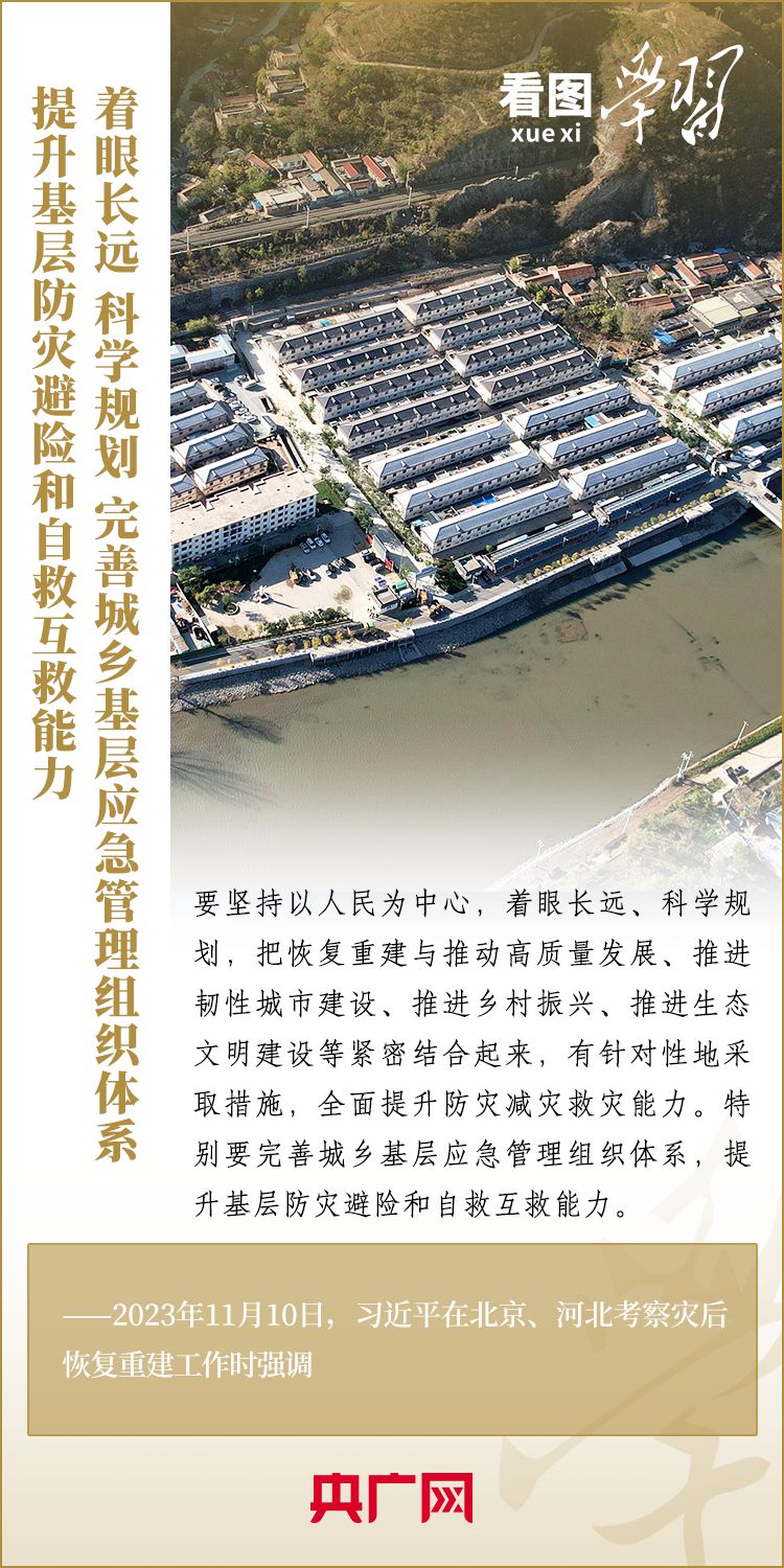 11月10日,習(xí)近平總書記在北京、河北考察災(zāi)后恢復(fù)重建工作。總書記深入學(xué)校、社區(qū)、村莊、水利工程工地,實地察看村容村貌,了解基礎(chǔ)設(shè)施恢復(fù)建設(shè)提升等情況,要求有關(guān)部門堅持以人民為中心,堅持系統(tǒng)觀念,著眼長遠(yuǎn)、科學(xué)規(guī)劃,把恢復(fù)重建與推動高質(zhì)量發(fā)展、推進(jìn)韌性城市建設(shè)、推進(jìn)鄉(xiāng)村振興、推進(jìn)生態(tài)文明建設(shè)等緊密結(jié)合起來,有針對性地采取措施,再接再厲抓好災(zāi)后恢復(fù)重建,確保廣大人民群眾安居樂業(yè)、溫暖過冬。