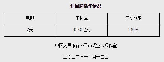 中新網(wǎng)11月14日電 據(jù)央行網(wǎng)站消息,為維護銀行體系流動性合理充裕,2023年11月14日人民銀行以利率招標方式開展了4240億元逆回購操作,中標利率1.80%,期限為7天。具體情況如下: