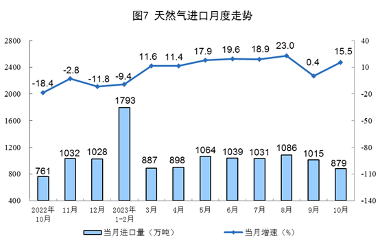 天然氣生產(chǎn)保持平穩(wěn),進口增速加快。10月份,生產(chǎn)天然氣190億立方米,同比增長2.6%,增速比9月份回落6.7個百分點,日均產(chǎn)量6.1億立方米。進口天然氣879萬噸,同比增長15.5%,增速比9月份加快15.1個百分點。