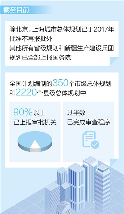 自然資源部國(guó)土空間規(guī)劃局局長(zhǎng)張兵介紹,截至目前,除北京、上海城市總體規(guī)劃已于2017年批準(zhǔn)不再報(bào)批外,其他所有省級(jí)規(guī)劃和新疆生產(chǎn)建設(shè)兵團(tuán)規(guī)劃已全部上報(bào)國(guó)務(wù)院,其中江蘇、廣東、寧夏等省級(jí)規(guī)劃已經(jīng)批復(fù)。全國(guó)計(jì)劃編制的350個(gè)市級(jí)總體規(guī)劃和2220個(gè)縣級(jí)總體規(guī)劃中,90%以上已上報(bào)審批機(jī)關(guān),過半數(shù)已完成審查程序,江蘇、廣東的部分市級(jí)總體規(guī)劃已由省級(jí)人民政府批準(zhǔn)實(shí)施。