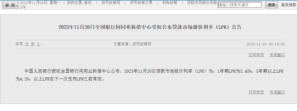 中新網(wǎng)11月20日電 據(jù)央行網(wǎng)站消息,中國人民銀行授權(quán)全國銀行間同業(yè)拆借中心公布,2023年11月20日貸款市場報價利率(LPR)為:1年期LPR為3.45%,5年期以上LPR為4.2%。以上LPR在下一次發(fā)布LPR之前有效。