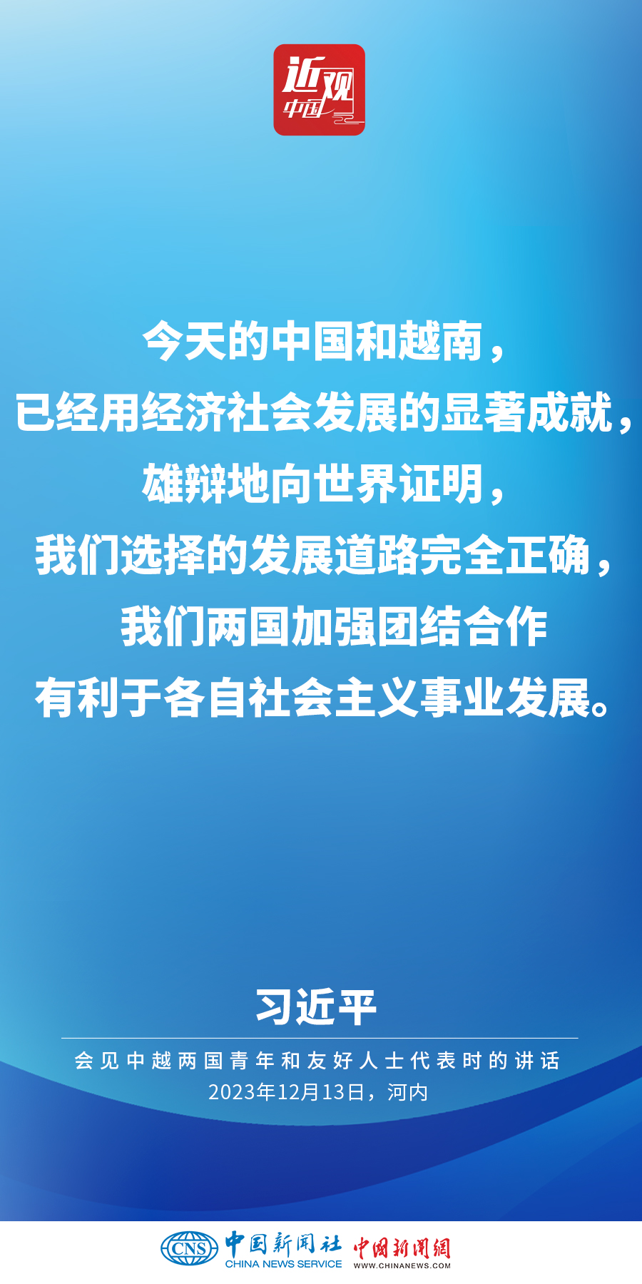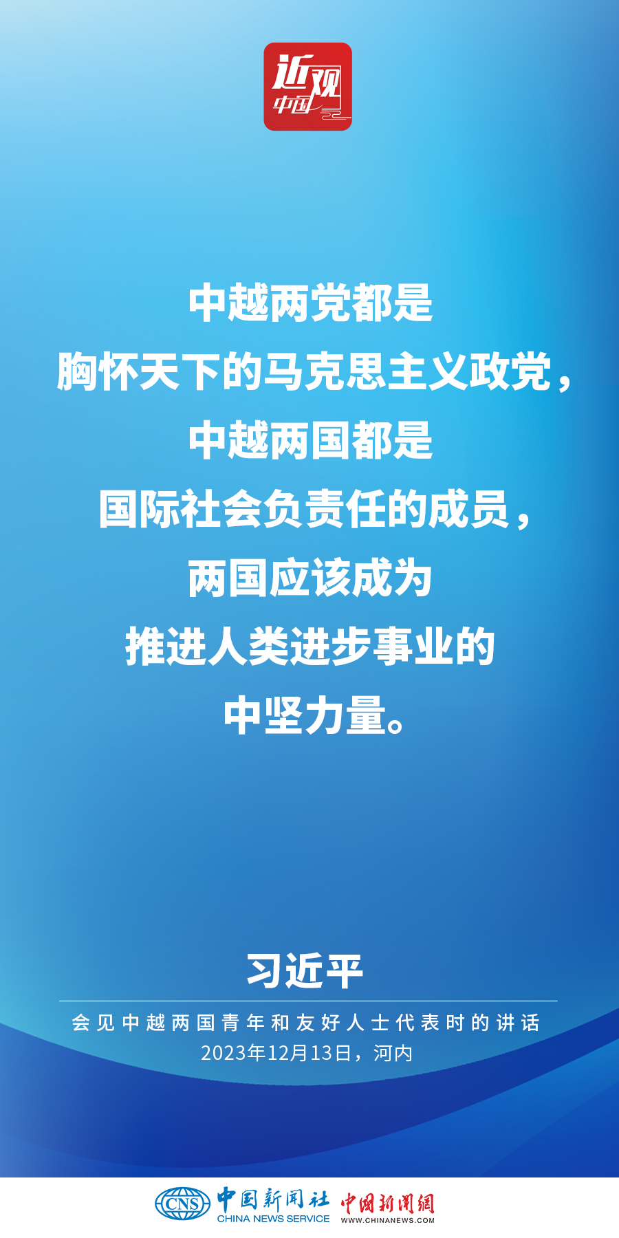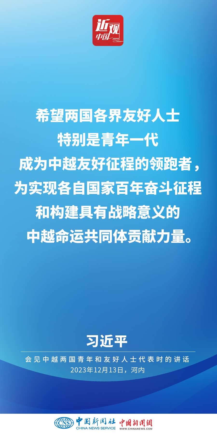 當(dāng)?shù)貢r(shí)間12月13日下午,中共中央總書記、國家主席習(xí)近平和夫人彭麗媛在河內(nèi)同越共中央總書記阮富仲夫婦共同會(huì)見中越兩國青年和友好人士代表。他在題為《賡續(xù)傳統(tǒng)友誼,開創(chuàng)中越命運(yùn)共同體建設(shè)新征程》的重要講話中指出,展望未來,我們要始終不忘初心,牢記使命,攜手走好各自社會(huì)主義道路,讓工業(yè)化現(xiàn)代化建設(shè)成果更多惠及兩國人民,共同為人類進(jìn)步事業(yè)作出更大貢獻(xiàn)。