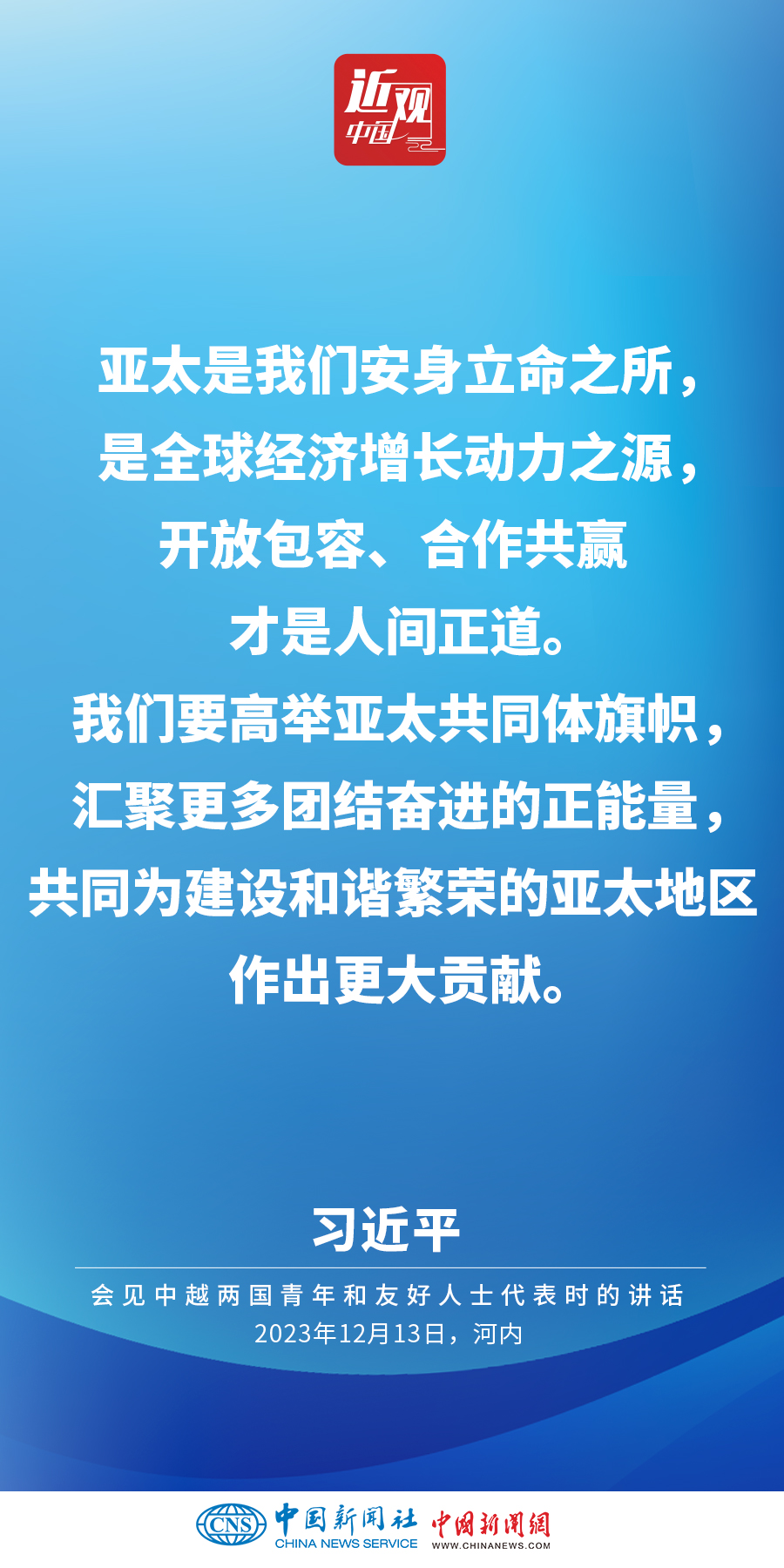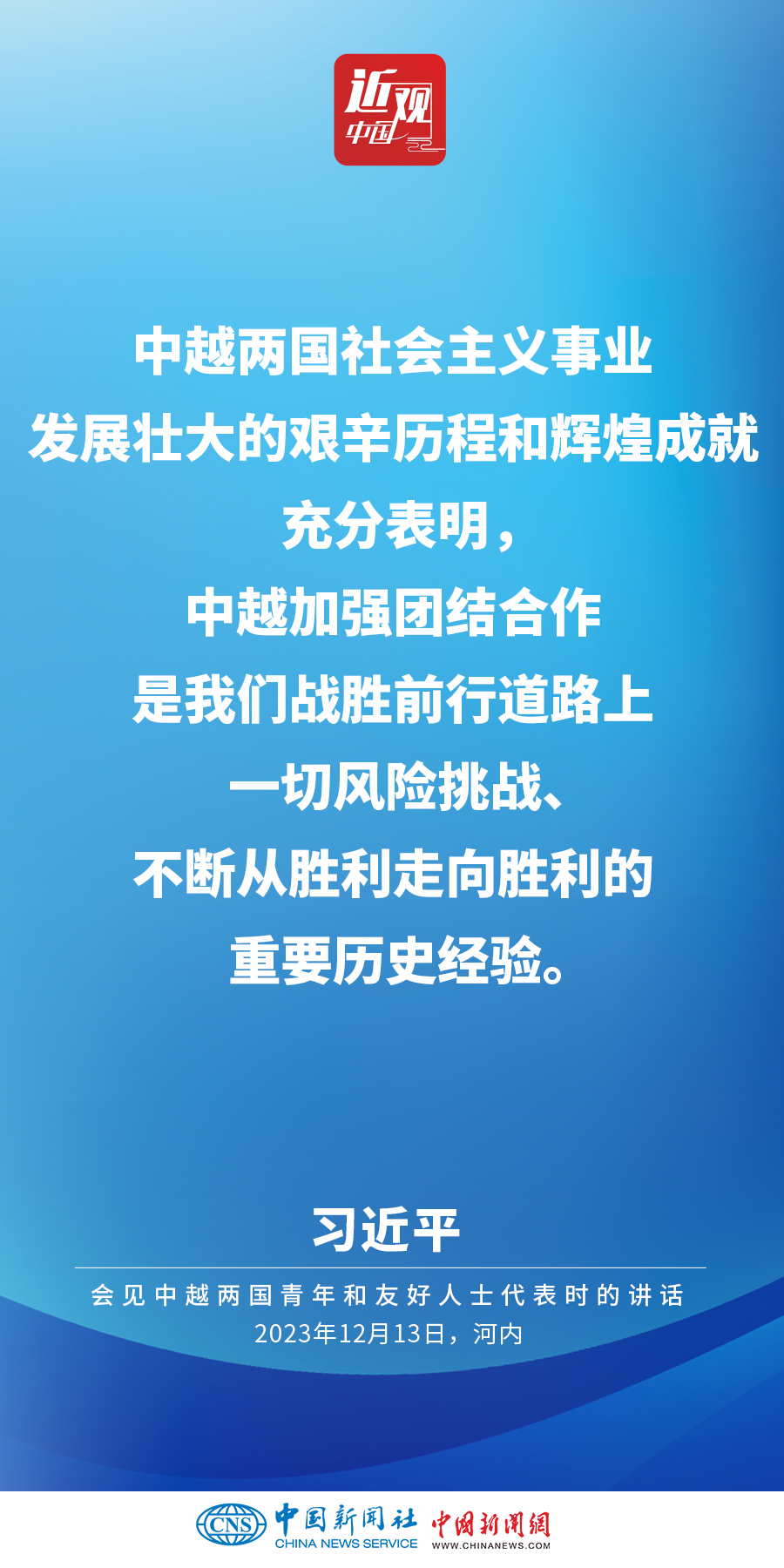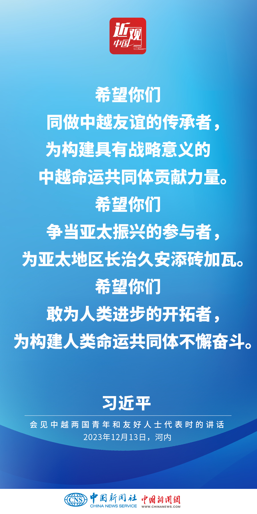 當(dāng)?shù)貢r(shí)間12月13日下午,中共中央總書記、國家主席習(xí)近平和夫人彭麗媛在河內(nèi)同越共中央總書記阮富仲夫婦共同會(huì)見中越兩國青年和友好人士代表。他在題為《賡續(xù)傳統(tǒng)友誼,開創(chuàng)中越命運(yùn)共同體建設(shè)新征程》的重要講話中指出,展望未來,我們要始終不忘初心,牢記使命,攜手走好各自社會(huì)主義道路,讓工業(yè)化現(xiàn)代化建設(shè)成果更多惠及兩國人民,共同為人類進(jìn)步事業(yè)作出更大貢獻(xiàn)。