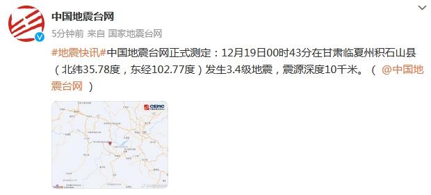 甘肅臨夏州積石山縣發(fā)生3.4級(jí)地震 震源深度10千米