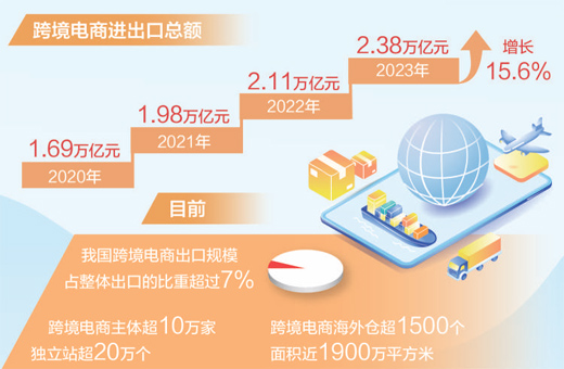 據(jù)海關(guān)測算,2023年,我國跨境電商進(jìn)出口總額2.38萬億元,增長15.6%。其中,出口1.83萬億元,增長19.6%;進(jìn)口5483億元,增長3.9%??缇畴娚炭焖侔l(fā)展,既滿足了國內(nèi)消費(fèi)者多樣化個(gè)性化需求,又助力我國產(chǎn)品通達(dá)全球,成為外貿(mào)發(fā)展的重要?jiǎng)幽堋?/p>