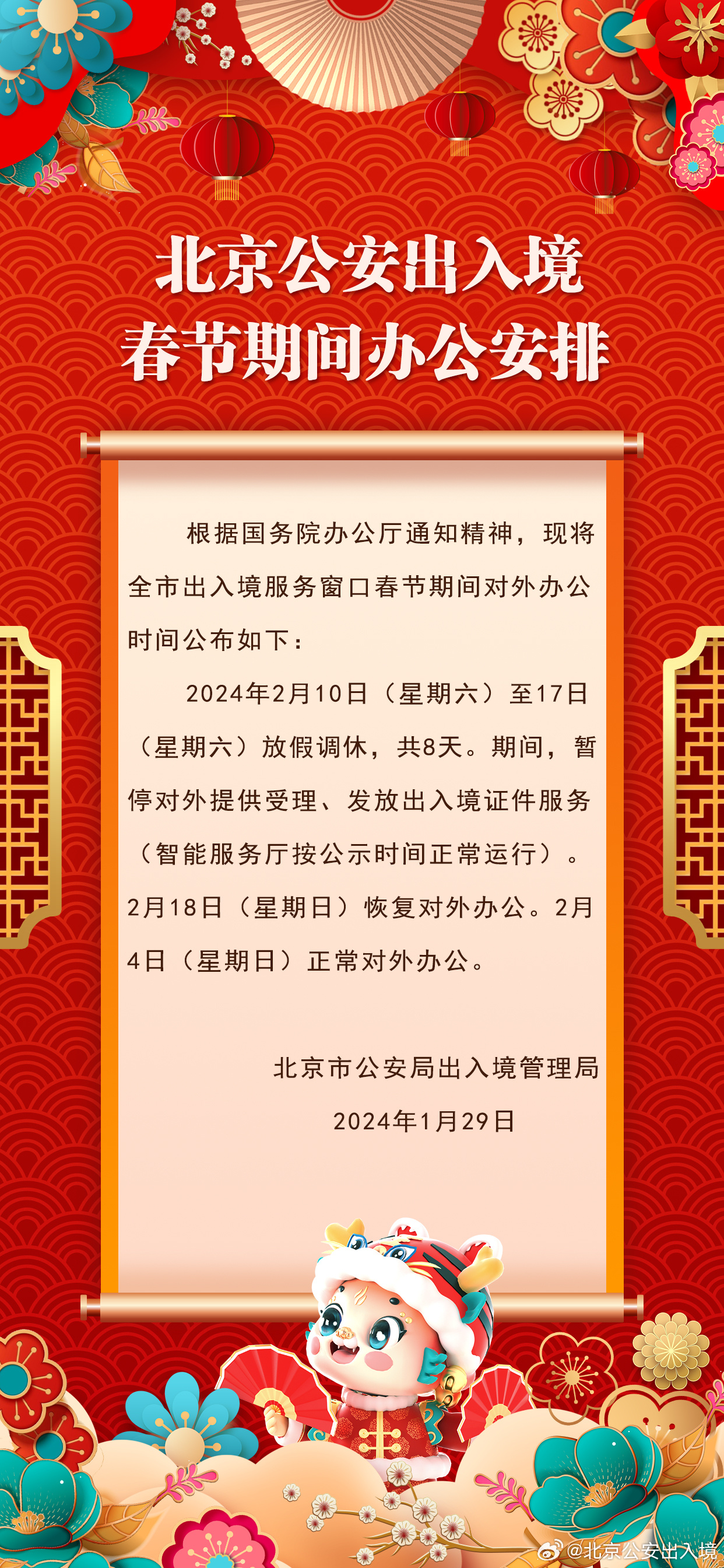 中新網(wǎng)1月29日電 據(jù)北京市公安局出入境管理局官方微博消息,北京市公安局出入境管理局發(fā)布春節(jié)期間辦公安排:北京市出入境服務(wù)窗口2月10日至17日(大年初一至初八)放假調(diào)休,共8天。期間,暫停對外提供受理、發(fā)放出入境證件服務(wù)(智能服務(wù)廳按公示時間正常運行)。2月18日(星期日)恢復(fù)對外辦公。2月4日(星期日)正常對外辦公。