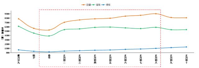 預(yù)計春節(jié)期間全國高速公路客車日均流量約4890萬輛,小客車占客車比例預(yù)計達(dá)99%以上。貨車流量在春節(jié)節(jié)前逐日下降,在正月初一達(dá)到最低值,春節(jié)假期之后逐漸恢復(fù)到日常水平,但貨車流量同比去年預(yù)計有所增長。