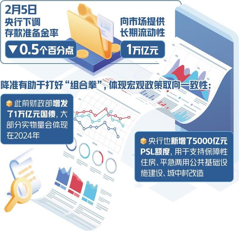 “降準有助于打好‘組合拳’,體現(xiàn)宏觀政策取向一致性?!饼嬩檫M一步表示,中央經(jīng)濟工作會議強調要增強宏觀政策取向一致性,強化政策統(tǒng)籌,確保同向發(fā)力、形成合力。此前財政部增發(fā)了1萬億元國債,大部分實物量會體現(xiàn)在2024年,央行也新增了5000億元抵押補充貸款(PSL)額度,用于支持保障性住房、平急兩用公共基礎設施建設、城中村改造,存量政策將持續(xù)體現(xiàn)經(jīng)濟帶動效應。這次降準也是宏觀政策取向一致性的體現(xiàn),有望與前期政策形成合力,進一步推動經(jīng)濟回升向好。近期,財政部還表示將繼續(xù)安排一定規(guī)模的地方政府專項債券,適當增加中央預算內投資規(guī)模,發(fā)揮好政府投資的帶動放大效應,央行及時降準也能為后續(xù)系列穩(wěn)需求、穩(wěn)增長政策營造適宜的流動性環(huán)境。