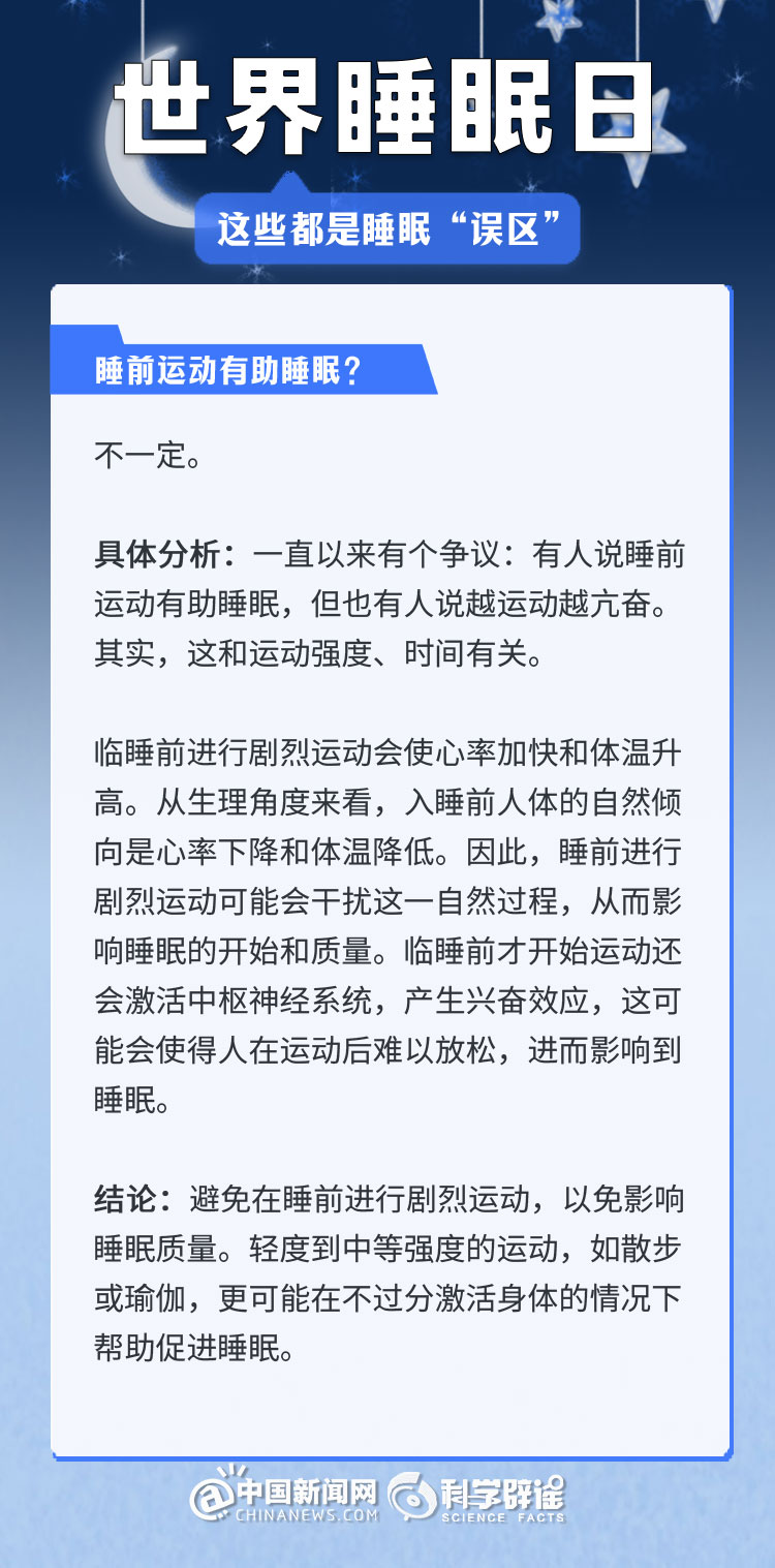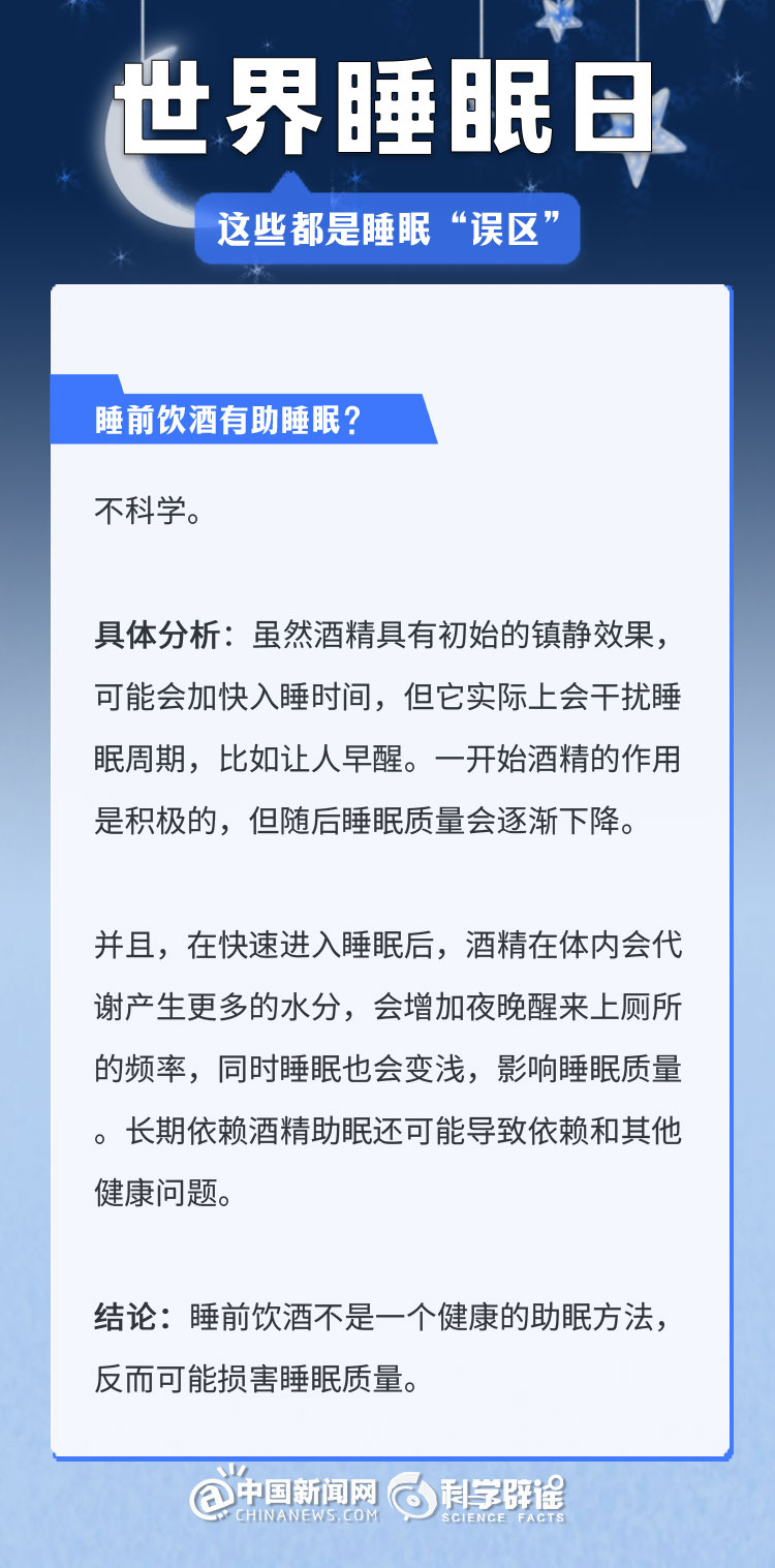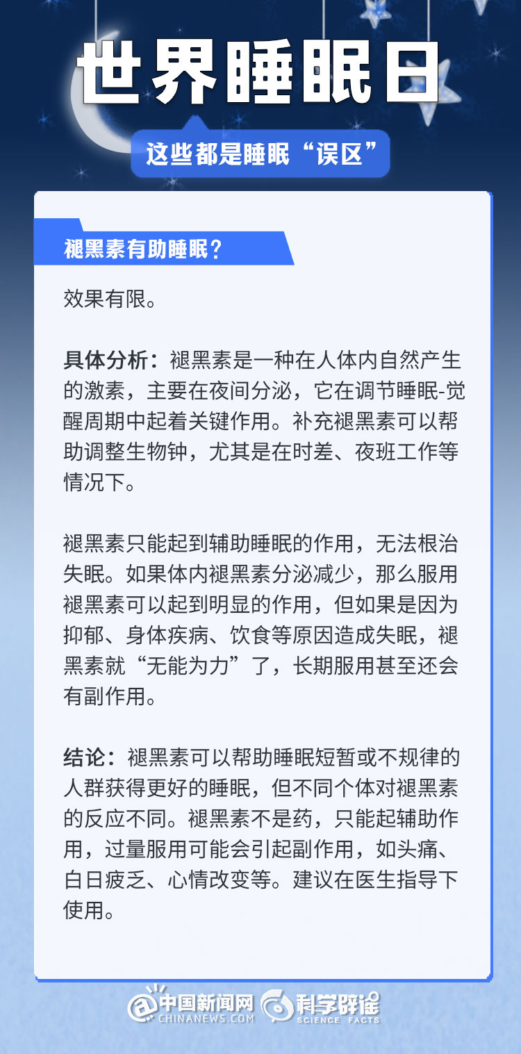 中新網3月21日電 《中國睡眠研究報告(2024)》顯示,2023年居民睡眠指數(shù)為62.61分,較2022年降低了5.16。去年的報告中,曾有近半數(shù)民眾每晚平均睡眠時長不足8小時(47.55%)。很多人正在經受著睡眠問題的困擾,為了避免大家被誤導,我們總結了幾個生活中常見的睡眠誤區(qū),一起來了解一下吧!(來源:科學辟謠 中國新聞網微博)
