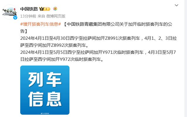 中新網(wǎng)3月22日電 據(jù)中國(guó)國(guó)家鐵路集團(tuán)有限公司官方微博消息,中國(guó)鐵路青藏集團(tuán)有限公司3月22日發(fā)布關(guān)于加開(kāi)臨時(shí)旅客列車(chē)的公告:2024年4月1日至4月30日西寧至拉薩間加開(kāi)Z8991次旅客列車(chē),4月1、2、3日拉薩至西寧間加開(kāi)Z8992次旅客列車(chē)。2024年4月1日至5月5日西寧至拉薩間加開(kāi)Y971次臨時(shí)旅客列車(chē),4月3日至5月7日拉薩至西寧間加開(kāi)Y972次臨時(shí)旅客列車(chē)。