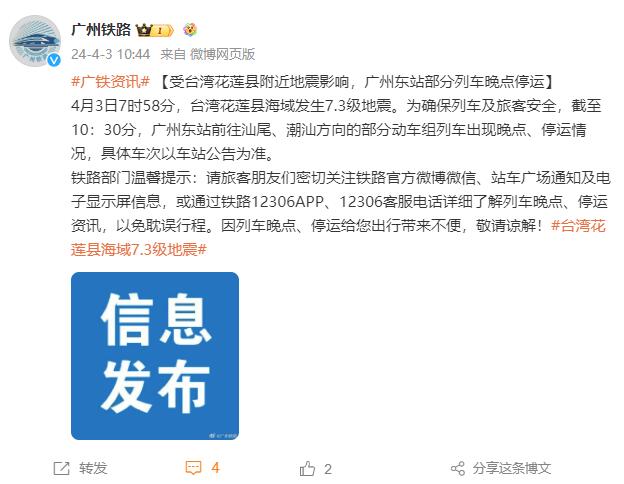 中新網(wǎng)4月3日電 據(jù)中國鐵路廣州局集團(tuán)有限公司官方微博消息,4月3日7時(shí)58分,臺(tái)灣花蓮縣海域發(fā)生7.3級(jí)地震。為確保列車及旅客安全,截至10:30分,廣州東站前往汕尾、潮汕方向的部分動(dòng)車組列車出現(xiàn)晚點(diǎn)、停運(yùn)情況,具體車次以車站公告為準(zhǔn)。
