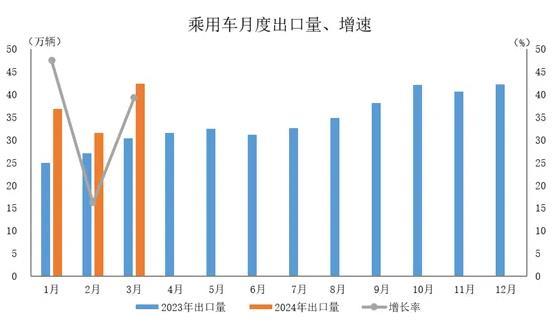 2024年3月,乘用車出口42.4萬輛,環(huán)比增長(zhǎng)34.6%,同比增長(zhǎng)39.3%。