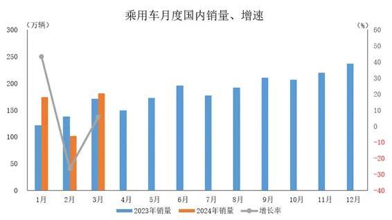 2024年3月,乘用車國內(nèi)銷量181.2萬輛,環(huán)比增長(zhǎng)78.1%,同比增長(zhǎng)5.8%。