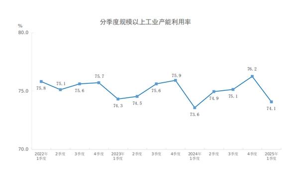 分三大門類看,2025年一季度,采礦業(yè)產(chǎn)能利用率為74.6%,比上年同期下降0.4個百分點;制造業(yè)產(chǎn)能利用率為74.1%,上升0.3個百分點;電力、熱力、燃氣及水生產(chǎn)和供應業(yè)產(chǎn)能利用率為73.6%,上升2.4個百分點。