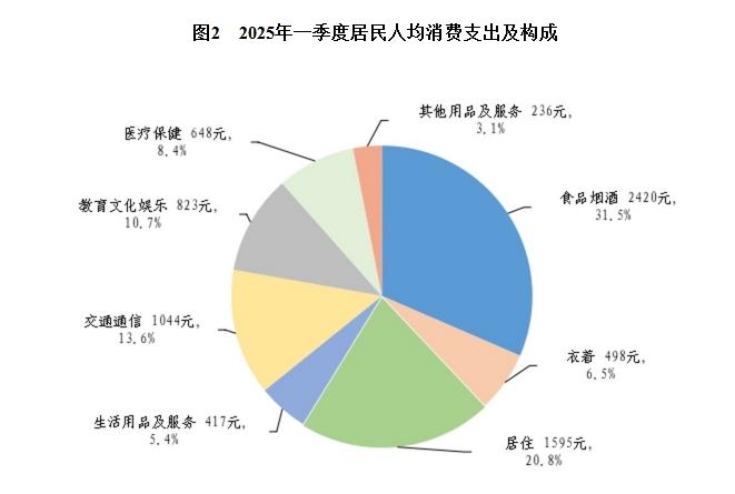 一季度,全國居民人均食品煙酒消費支出2420元,增長2.8%,占人均消費支出的比重為31.5%;人均衣著消費支出498元,增長1.2%,占人均消費支出的比重為6.5%;人均居住消費支出1595元,增長2.1%,占人均消費支出的比重為20.8%;人均生活用品及服務消費支出417元,增長9.6%,占人均消費支出的比重為5.4%;人均交通通信消費支出1044元,增長10.4%,占人均消費支出的比重為13.6%;人均教育文化娛樂消費支出823元,增長13.9%,占人均消費支出的比重為10.7%;人均醫(yī)療保健消費支出648元,增長3.0%,占人均消費支出的比重為8.4%;人均其他用品及服務消費支出236元,增長9.9%,占人均消費支出的比重為3.1%。
