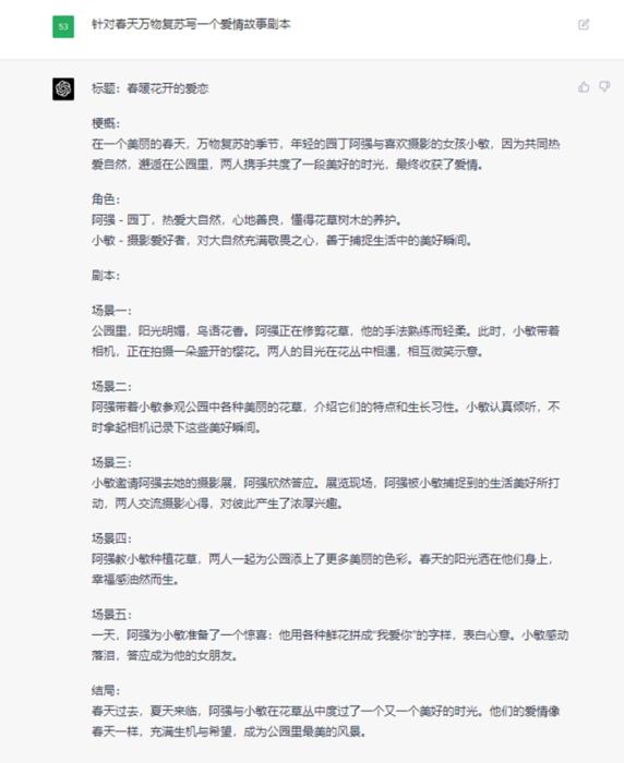 目前GPT-4僅限于ChatGPT Plus訂戶使用。記者體驗時發(fā)現(xiàn),GPT-4生成速度比較慢,但回答簡明扼要,更有創(chuàng)造性,無論是寫詩歌還是故事劇本都不在話下。例如它可以根據(jù)“春天萬物復蘇”賦詩一首或者寫成一個愛情故事的劇本。