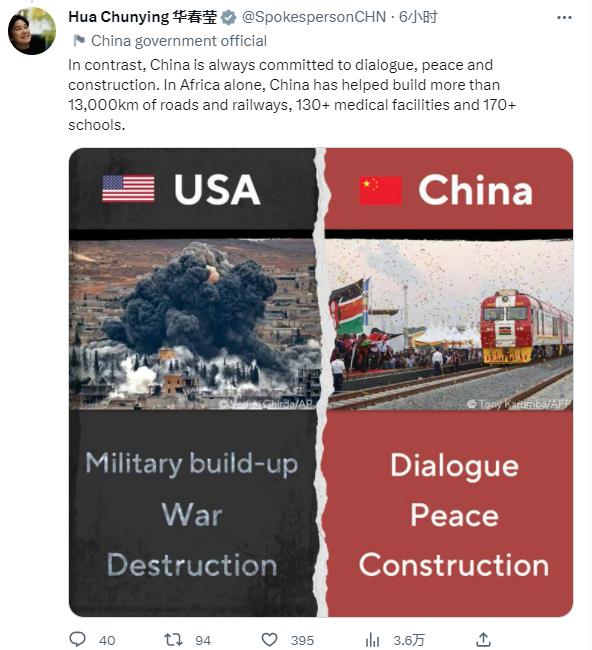 華春瑩接著在第二條推文中發(fā)了一張中美對比圖,圖中顯示美國沉迷于軍事建設、戰(zhàn)爭和破壞。“相比之下,中國始終堅持對話、和平、建設。僅在非洲,中國就援建了1.3萬多公里公路和鐵路、130多個醫(yī)療設施、170多所學校?!比A春瑩說。