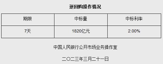中新網(wǎng)3月21日電 據(jù)央行網(wǎng)站21日消息,為維護銀行體系流動性合理充裕,2023年3月21日人民銀行以利率招標(biāo)方式開展了1820億元逆回購操作,期限為7天,中標(biāo)利率為2.00%。(中新財經(jīng))