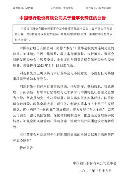 資料顯示,劉連舸生于1961年5月,曾任中國進(jìn)出口銀行黨委副書記、副董事長、行長等職。2019年6月至2023年2月,出任中國銀行黨委書記、董事長,2023年2月至3月任中國銀行董事長。