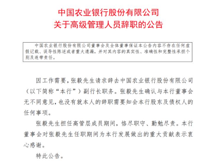 中國農(nóng)業(yè)銀行也人事變動不斷。21日,農(nóng)行公告稱,因工作需要,張毅請求辭去中國農(nóng)業(yè)銀行副行長職務(wù)。