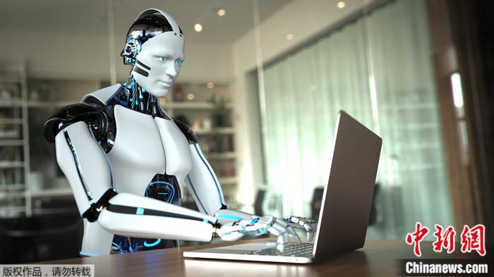 資料圖:人形機(jī)器人在電腦上打字的示意圖。